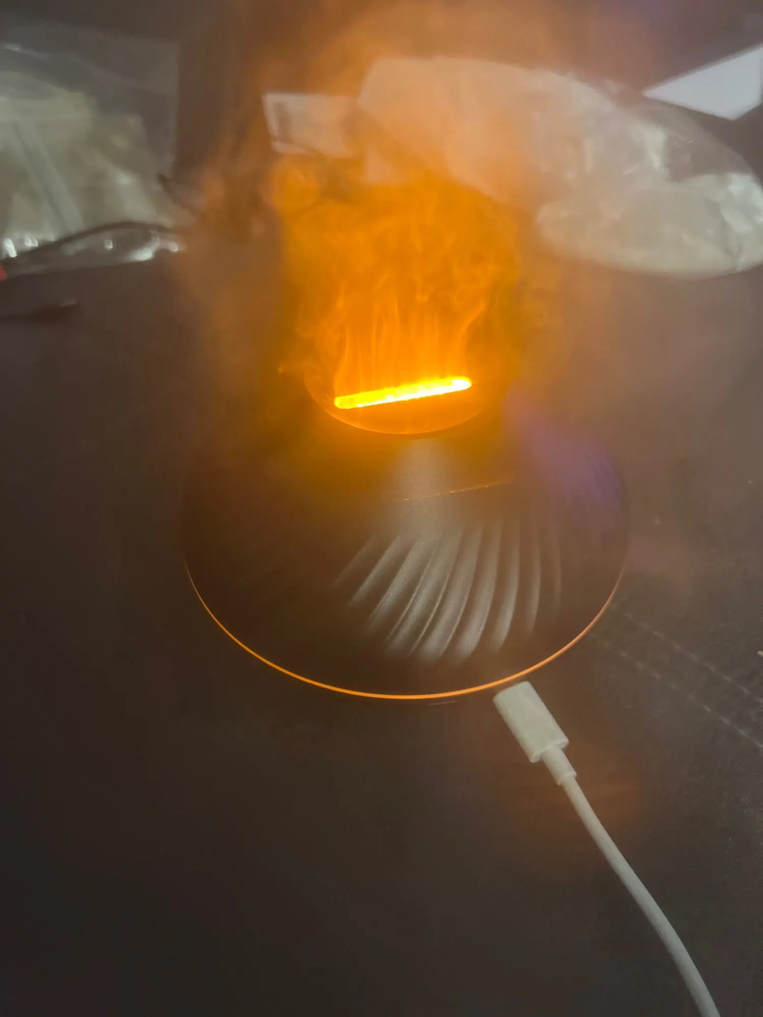 The mist rises and flickers like actual fire. Customers like to get a second one because they love watching it so much. It's compact enough for your work desk.